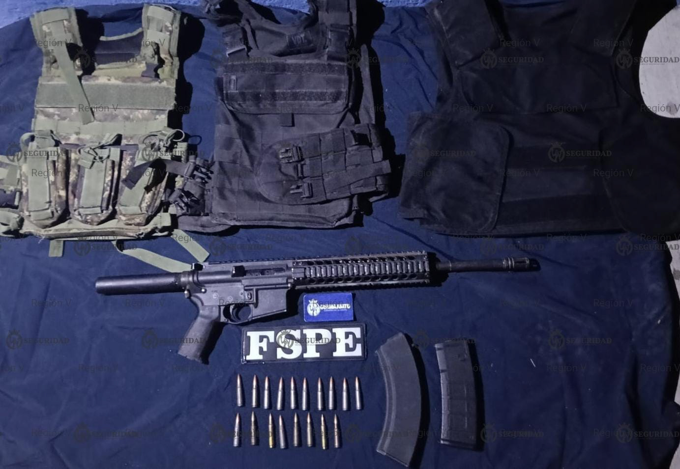 Durante el operativo se aseguró un arma larga, un cargador metálico y 16 cartuchos útiles calibre 7.62 x 39 mm, tres chalecos balísticos (dos en color negro y uno en color verde tipo militar), siete ponchallantas y un vehículo tipo Tacoma sin placas, con reporte de robo vigente del 4 de junio de 2025.