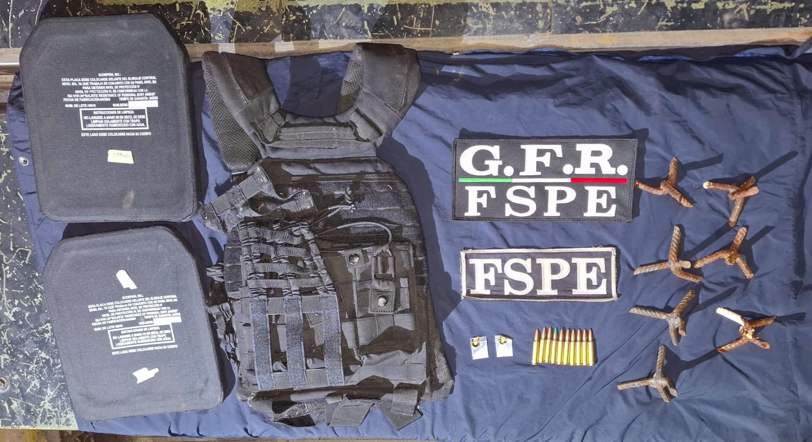 En el interior de la unidad fueron localizados un chaleco balístico color negro sin número de serie, dos placas balísticas, diez cartuchos útiles calibre 5.56x45 mm, dos bolsas tipo Ziploc con una sustancia granulada similar al cristal; además de siete artefactos metálicos conocidos como estrellas ponchallantas.
