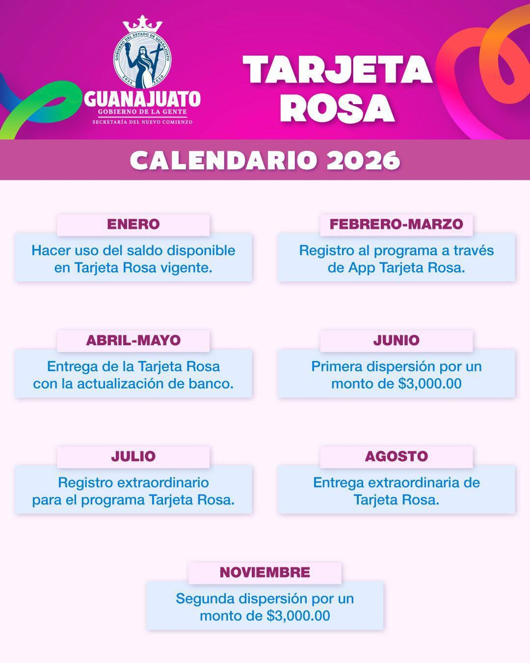 Guanajuato, Gto.– Con el inicio de 2026, el Gobierno del Estado de Guanajuato confirmó la continuidad del programa Tarjeta Rosa, dirigido a mujeres madres de familia de entre 25 y 45 años, y presentó el calendario oficial de registro, entrega y pagos para este año.