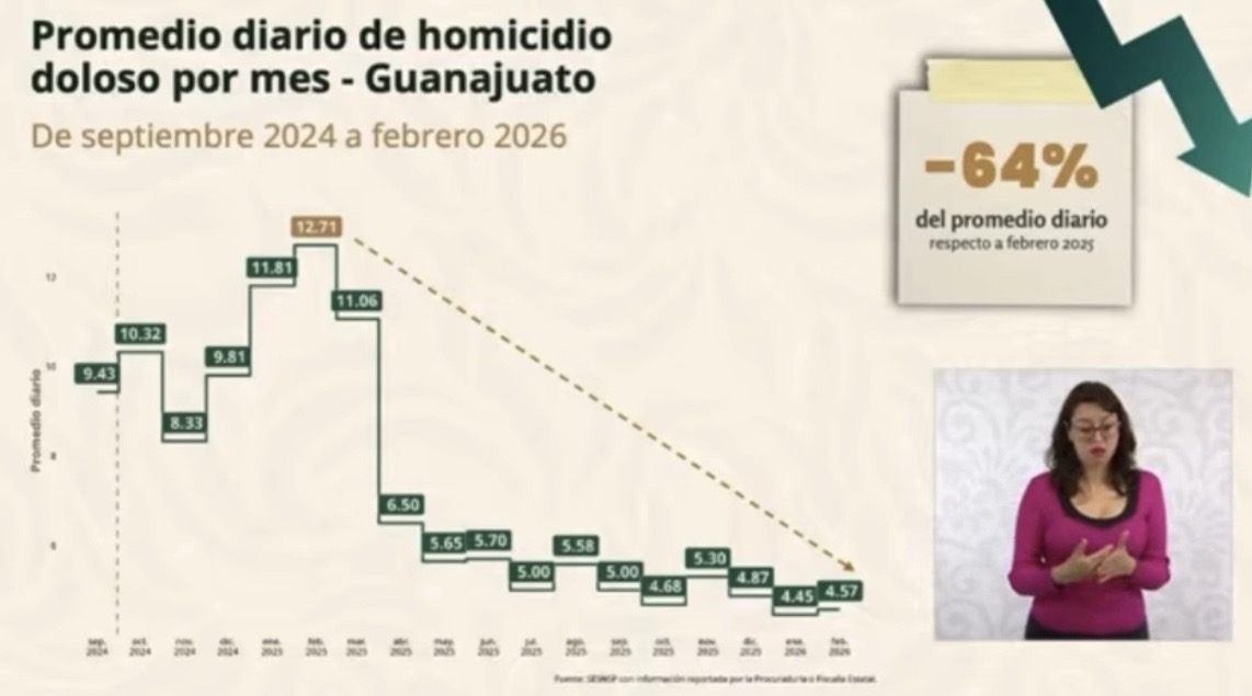 La titular del organismo, Marcela Figueroa Franco, informó que durante febrero de 2026 el promedio diario de este delito fue de 4.57 casos, lo que representa una disminución del 64 por ciento en comparación con febrero de 2025, cuando el promedio alcanzaba 12.71 homicidios diarios.