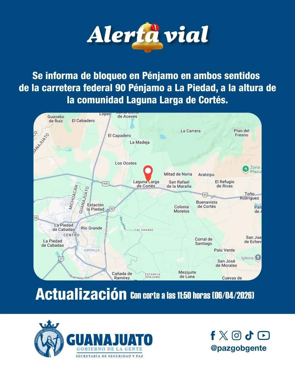 Pénjamo, Gto.– La Secretaría de Seguridad y Paz informó sobre un bloqueo registrado este lunes al mediodía en la carretera federal 90, en el tramo Pénjamo–La Piedad, el cual afecta la circulación en ambos sentidos.
