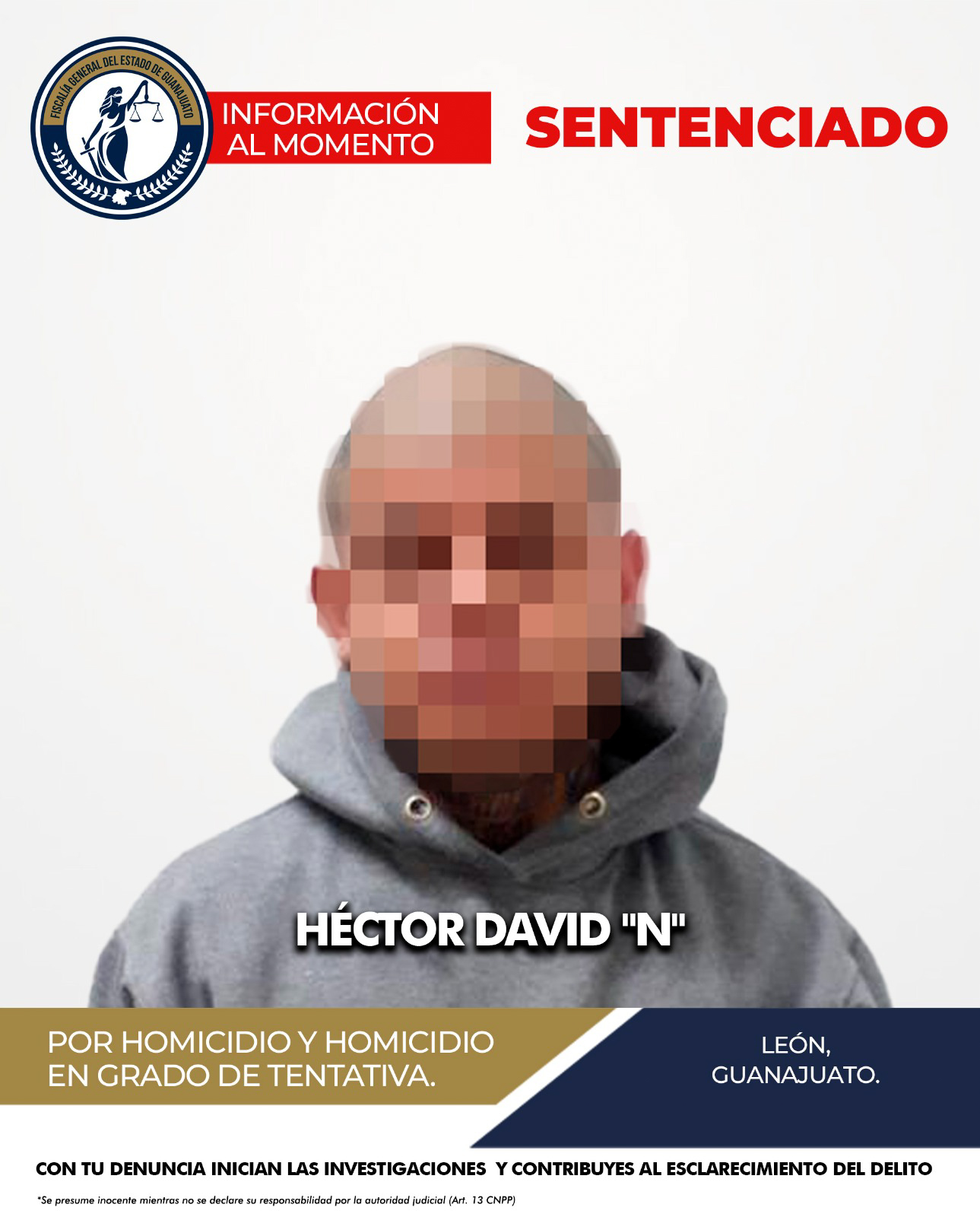 La Fiscalía General del Estado de Guanajuato sentenció al multihomicida Hector David “N”, alias el “Cebollín”, lo que se tradujo en 90 años de cárcel, generador de violencia desde el año 2021; culpable de atentar contra la vida de más de 3 personas.
