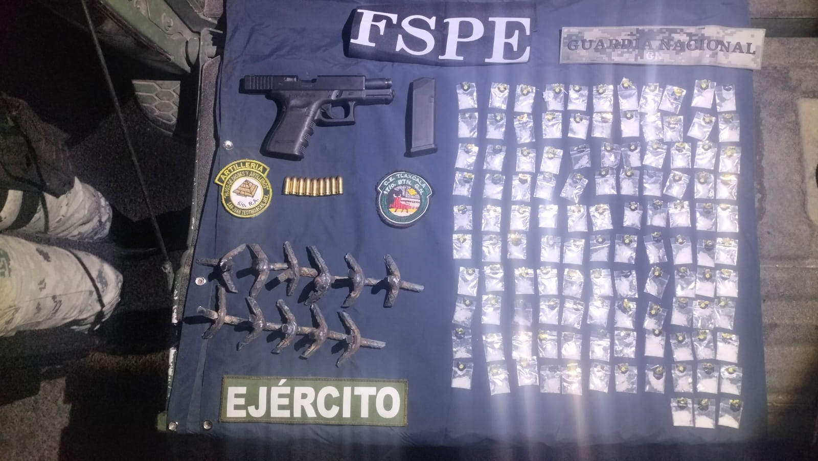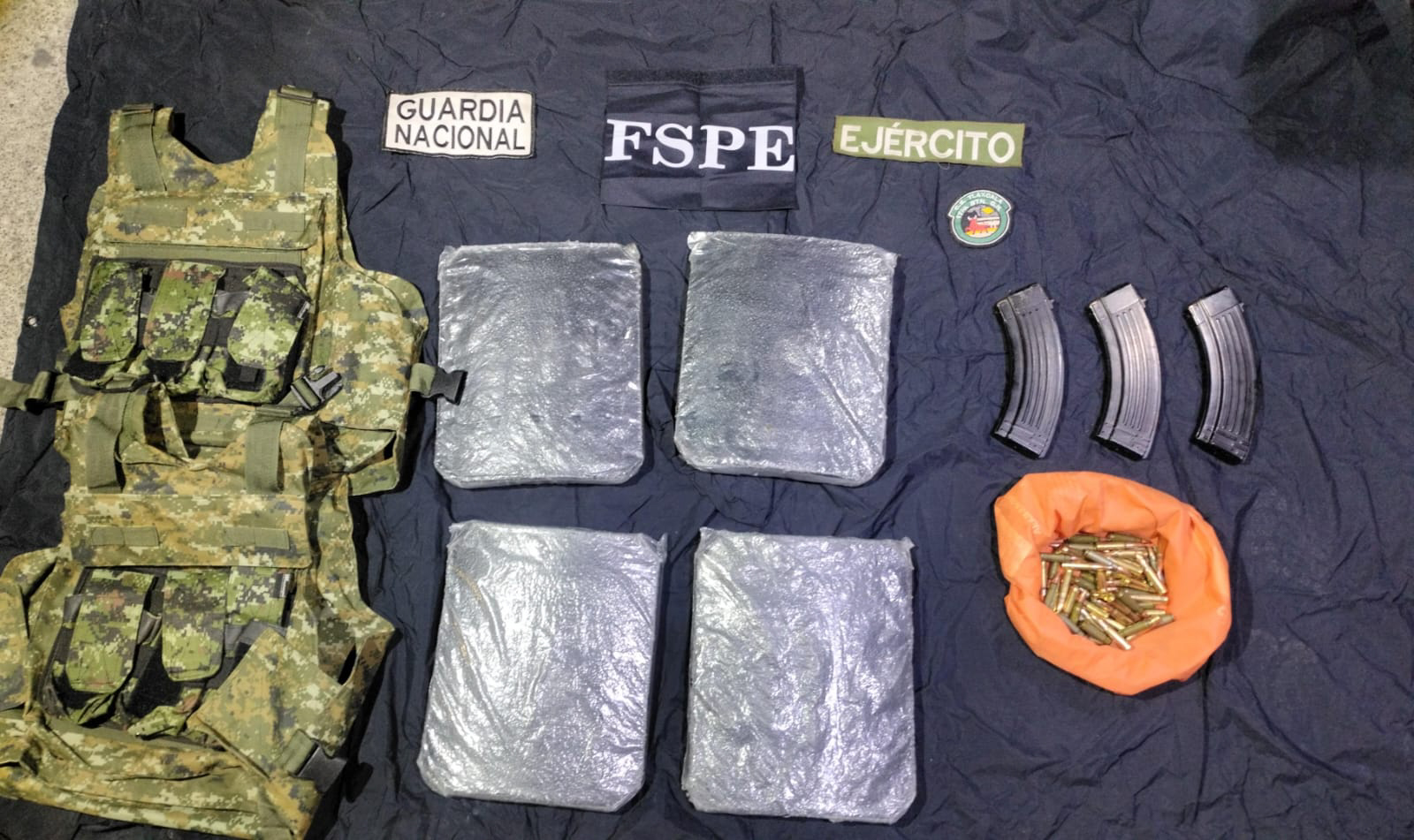 En total, fueron asegurados, 1 arma de fuego tipo Glock calibre 9 mm, 1 cargador con 9 cartuchos útiles, 3 cargadores metálicos para arma larga, 143 cartuchos útiles calibre 7.62x39 mm, Cartuchos útiles calibre .223, 114 dosis de presunta droga tipo cristal, 2 chalecos balísticos con placas balísticas, 11 artefactos metálicos conocidos como ponchallantas y1 vehículo con reporte de robo del 16 de mayo de 2025