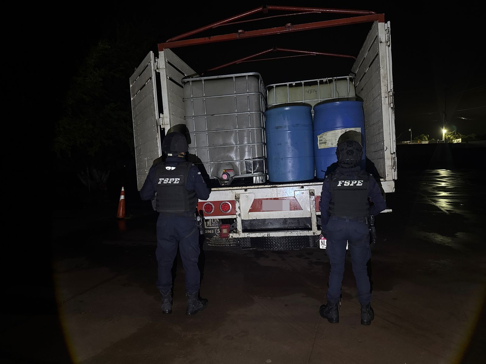 Posteriormente, en la comunidad Las Liebres de Suárez, los elementos estatales detectaron un fuerte olor a combustible y localizaron dos camionetas aparentemente abandonadas; una RAM modelo 2022, color blanco, con reporte de robo vigente, que transportaba cuatro contenedores de 1,200 litros (dos llenos, uno al 75% y otro al 50%), y una Ford F-450 modelo 2011, color blanco, cargada con cinco contenedores de 1,200 litros y dos tambos de 200 litros, todos llenos.