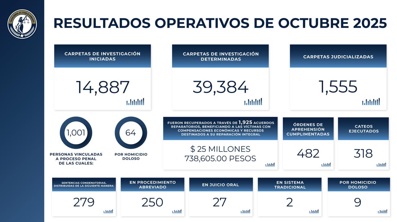 Durante el mes, la Fiscalía inició 14,887 carpetas de investigación y determinó 39,384, además de judicializar 1,555 casos. En total, 1,001 personas fueron vinculadas a proceso, 64 de ellas por homicidio doloso.