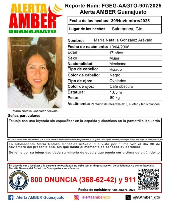 Guanajuato, Gto.- Las autoridades activaron en las últimas horas la Alerta Amber y el Protocolo Alba para localizar a Ángel Joseph Morales Cervantes y María Natalia González Arévalo, dos adolescentes de 17 años cuya desaparición genera preocupación entre sus familias, quienes temen que puedan ser víctimas de un delito.