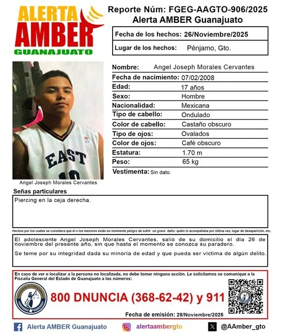 Ángel Joseph Morales Cervantes, originario de Pénjamo, fue visto por última vez el 26 de noviembre al salir de su domicilio.