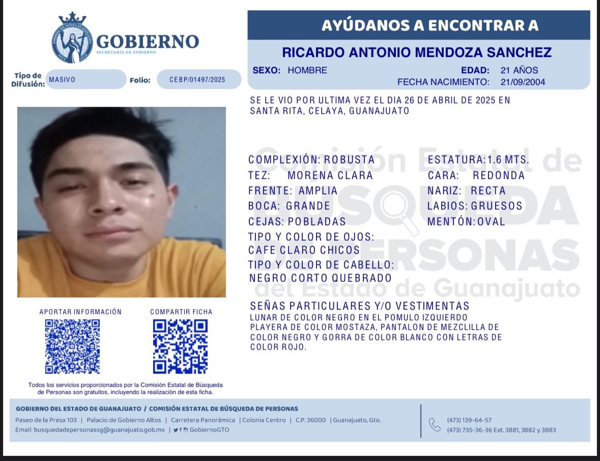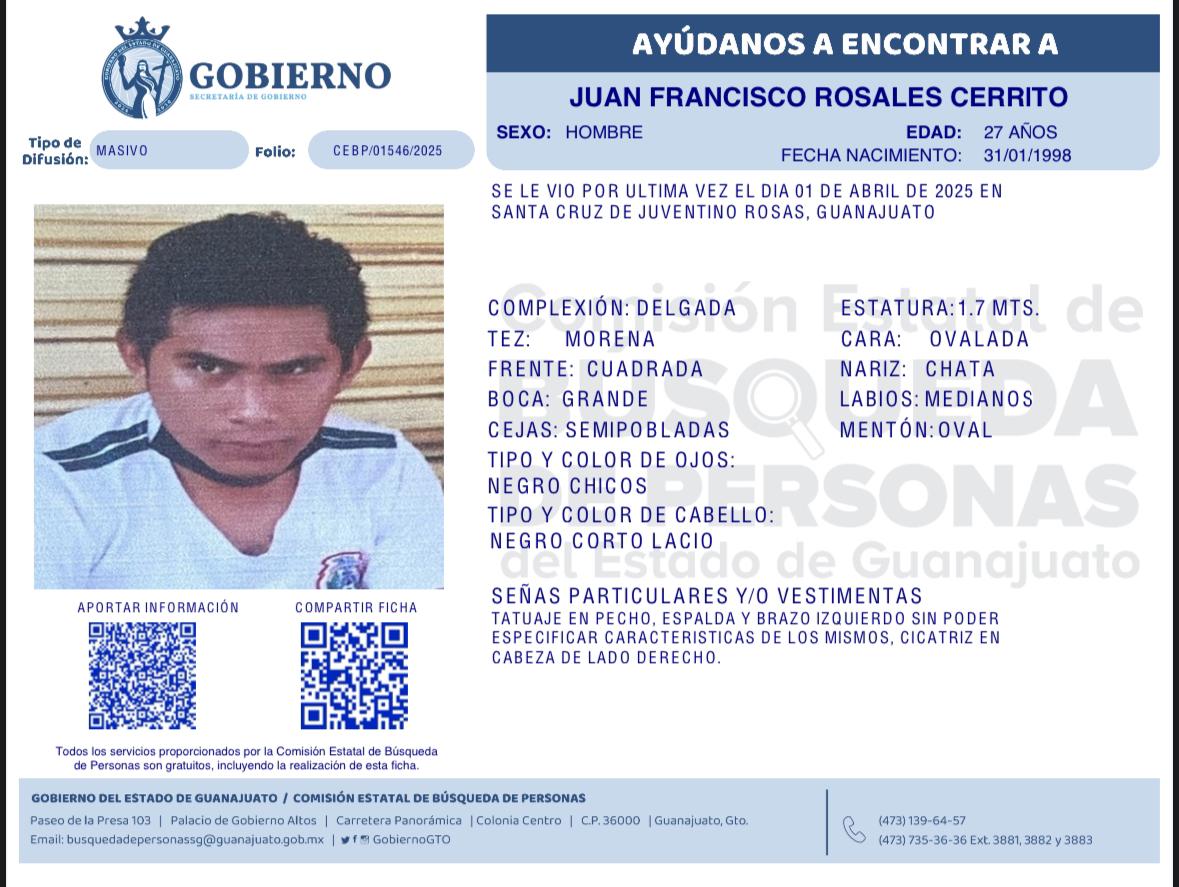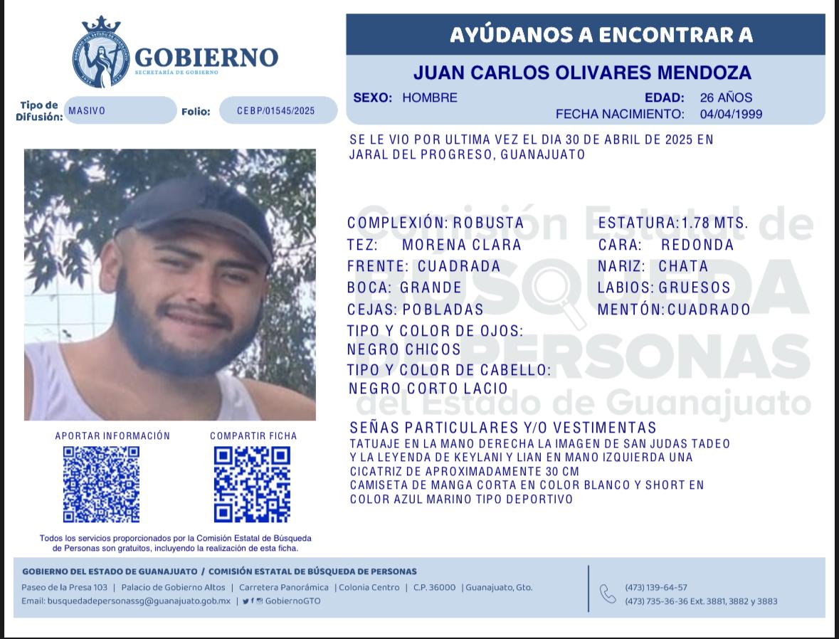 Por medio de la Comisión Estatal de Búsqueda de Personas se le insta a la población en la labor de búsqueda de las siguientes persona: Kevin García García visto por última vez el 25 de abril de 2024 en Valle de Santiago, Guanajuato; Juan Carlos Olivares Mendoza visto por última vez el 30 de abril de 2025 en Jaral del Progreso, Guanajuato; Juan Francisco Rosales Cerrito visto por última vez el 01 de abril de 2025 en Santa Cruz de Juventino Rosas, Guanajuato; Ricardo Antonio Mendoza Sánchez visto por última vez el 26 de abril de 2025 en Santa Rita, Celaya, Guanajuato.