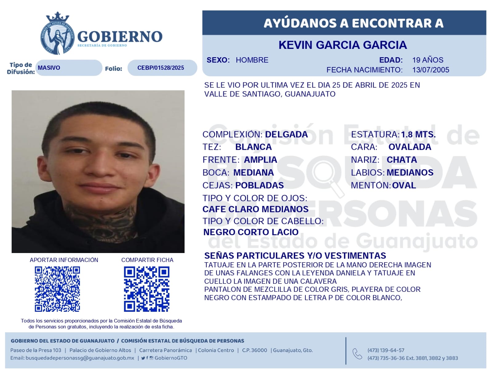 Se solicita el apoyo de la ciudadana con la difusión de las fichas de búsqueda, en caso de que algún ciudadano tenga información que den con el paradero de alguna de las personas mencionadas, favor de comunicarse con la Comisión Estatal de Búsqueda de Personas vía WhatsApp al número 473 139 6457, al teléfono 473 735 3636 ext. 3881, 3882 y 3883; o mediante el correo busquedadepersonassg@guanajuato.gob.mx, agradeciendo la colaboración y total disposición para cualquier información adicional.