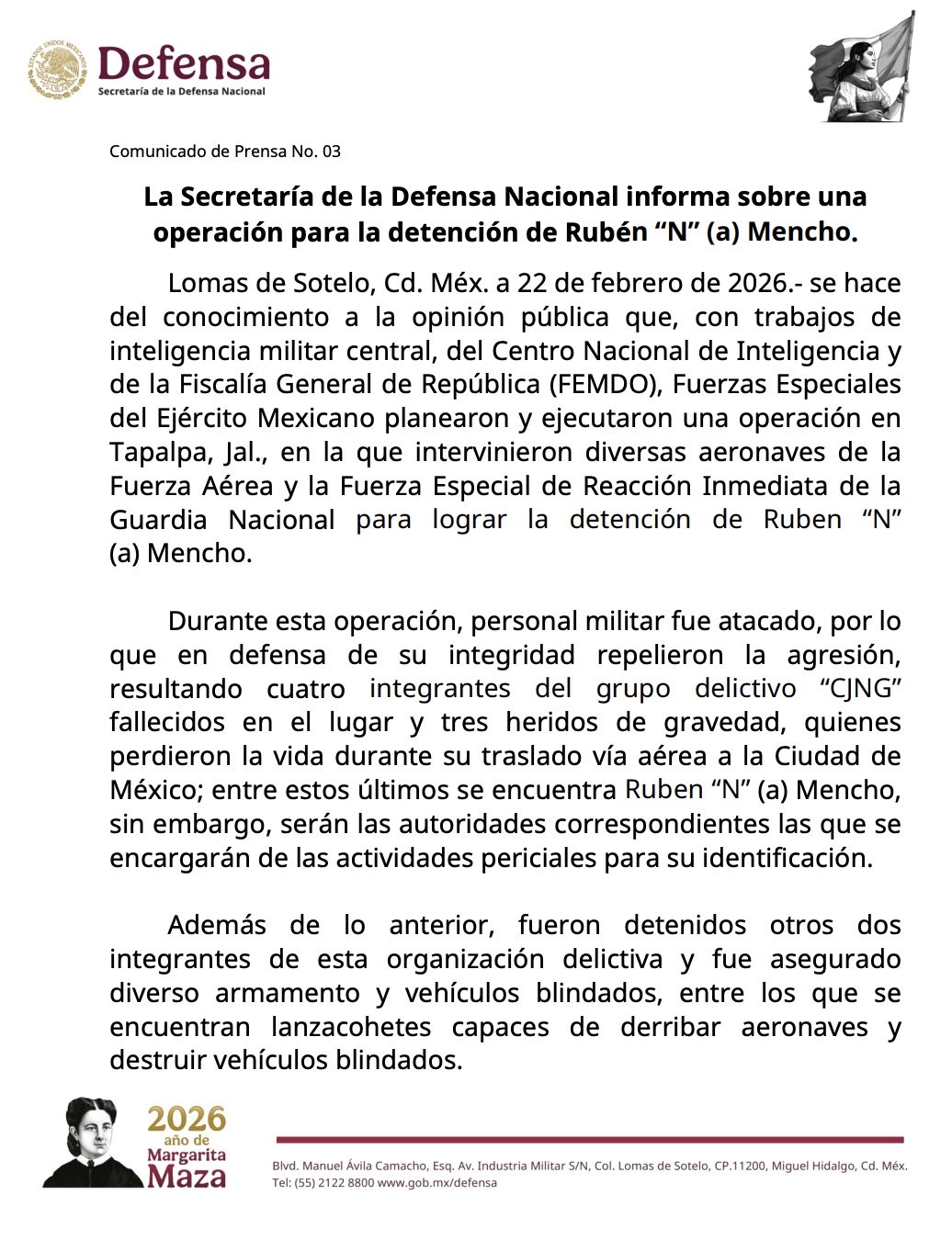 Según el comunicado oficial de la Secretaría de la Defensa Nacional, durante la intervención el personal militar fue agredido, por lo que repelió el ataque. En el lugar fallecieron cuatro integrantes del grupo delictivo y tres más resultaron heridos de gravedad, quienes perdieron la vida durante su traslado aéreo a la Ciudad de México. Entre ellos se encontraba Rubén “N”, alias “Mencho”, cuya identificación pericial quedará a cargo de las autoridades competentes.